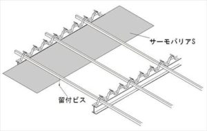 折板屋根下施工法は、折板屋根の下に軽量鉄骨で下地を組み、その下に遮熱シートをタッピングビスで軽量鉄骨の下地に取付けます。