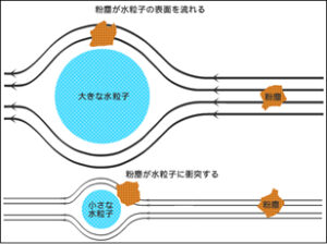 この働きによって、空間における粉塵の浮遊量を抑えることが可能です。ただし、水粒子と粉塵のサイズ差が大きい場合には、粉塵が水粒子の表面を押し流してしまうため、十分な効果が期待できません。