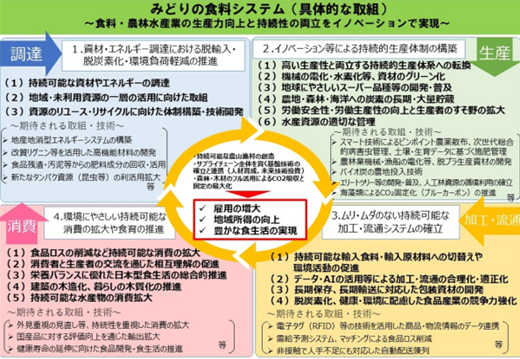 - 生産……イノベーションなどによる持続的生産体制の構築(機械の電化・水素化など、資材のグリーン化など)
