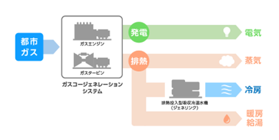 - ガスコージェネレーションシステム……発電時に発生する廃熱を、冷暖房・給湯などに活用する、分散型のエネルギー供給システムのこと。