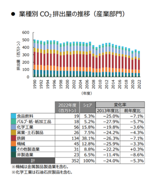 これは産業部門におけるエネルギー排出量のうち、約5%を占める数値です。前年比では7%の減少が見られたものの、依然として削減の余地は大きく、食品・飲料製造業においては、CO2排出量のさらなる削減に向けた取り組みが求められています。