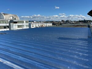 特許工法サーモバリアスカイ工法により折板屋根の上に遮熱材「スカイシート」を取り付けます。