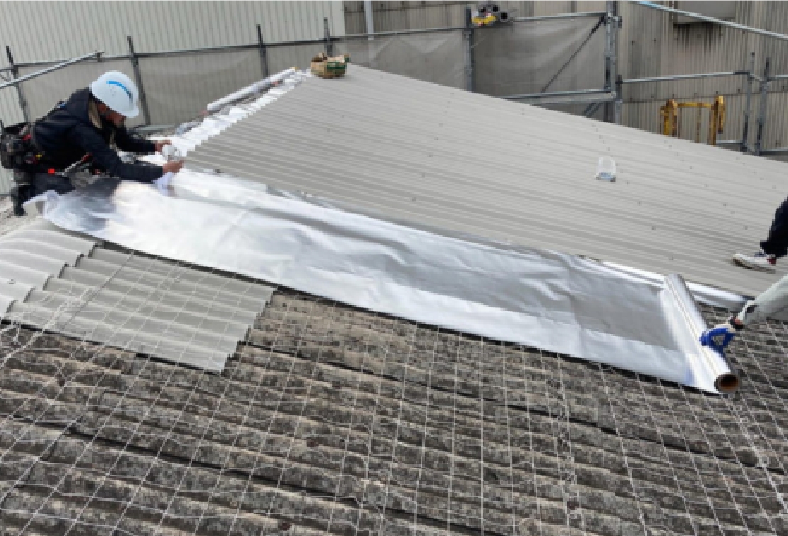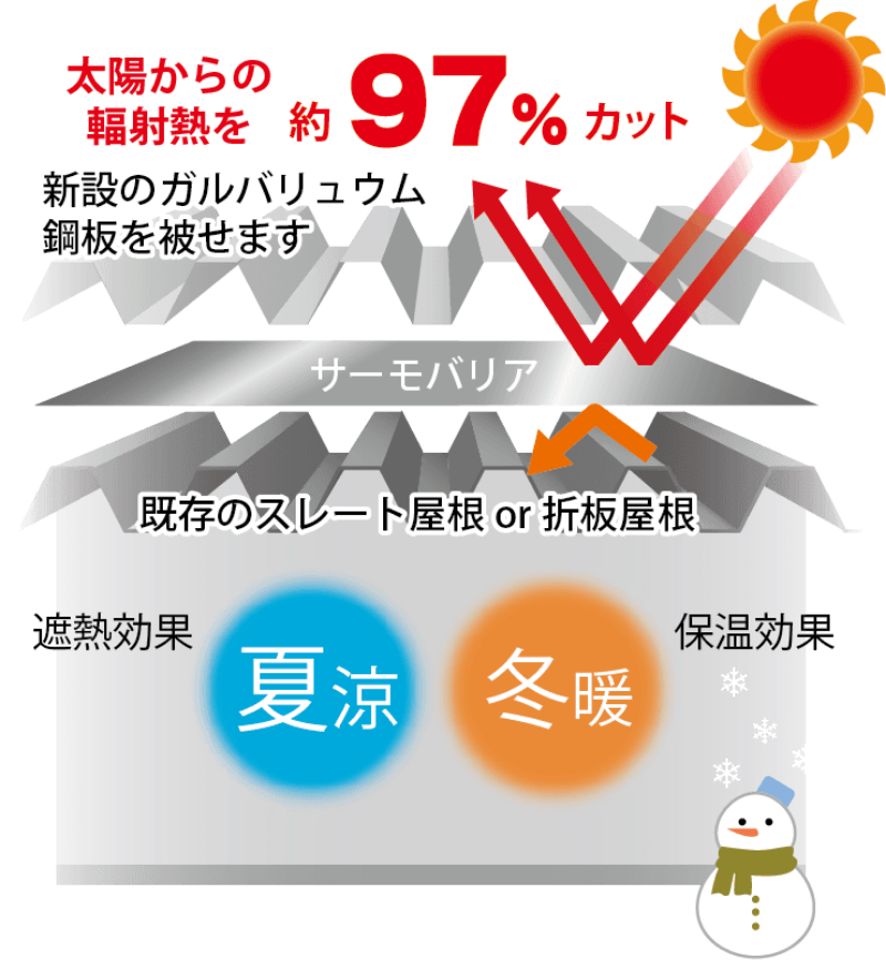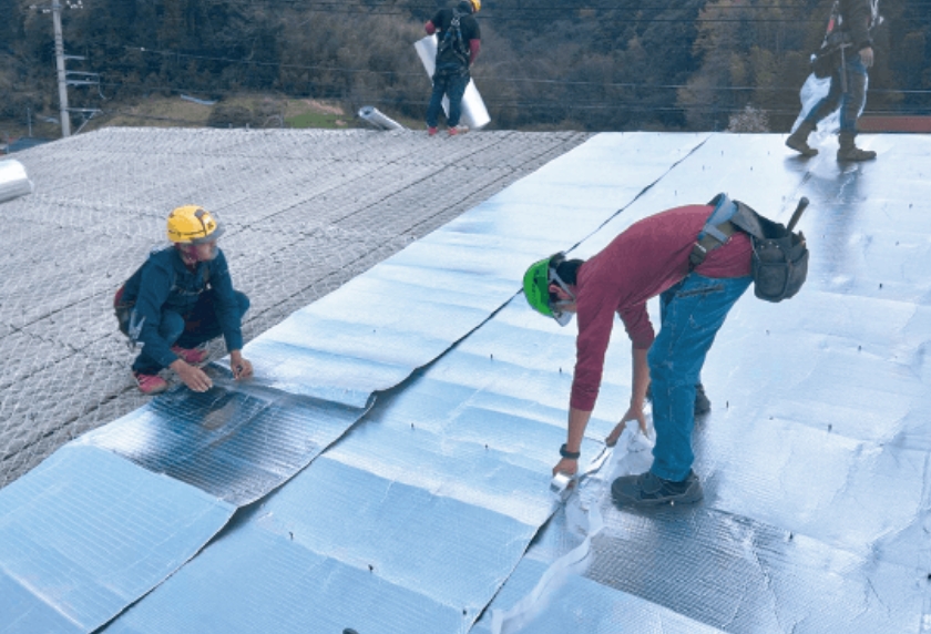 既存の屋根の上にサーモバリアを敷き、その上からカバー工法のガルバリュウム鋼板を取付けます。こうすることで太陽に熱せられたガルバリュウム鋼板の熱を反射し、室内の温度上昇を抑えます。