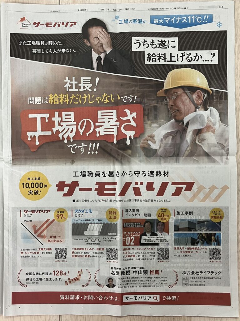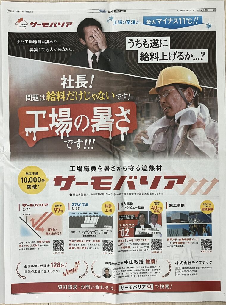 この度、2025年9月25日付の日本物流新聞(1面)、10月2日付の日本経済新聞(1面)にてサーモバリアの広告を掲載しました。